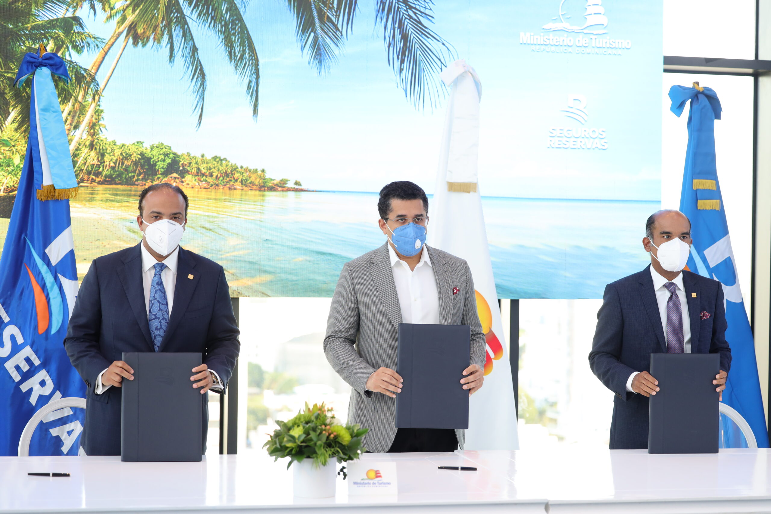 ​El Ministerio de Turismo, el Banco de Reservas y Seguros Reservas firmaron un convenio de cooperación, que busca contribuir a cuidar la salud, el bienestar y la seguridad de los turistas y promover, además, una recuperación sostenible del sector, como parte del plan de recuperación del turismo responsable ante el Covid-19.